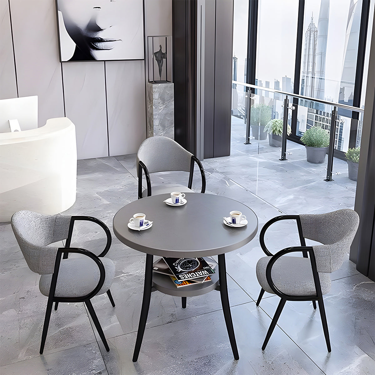 メラミン化粧板 耐久性 棚付き 丸型天板 スチールフレーム 高反発ウレタン 快適 チェア テーブル 応接セット 洗練 落ち着き シンプル カスタマイズ可能 JDZH-C021