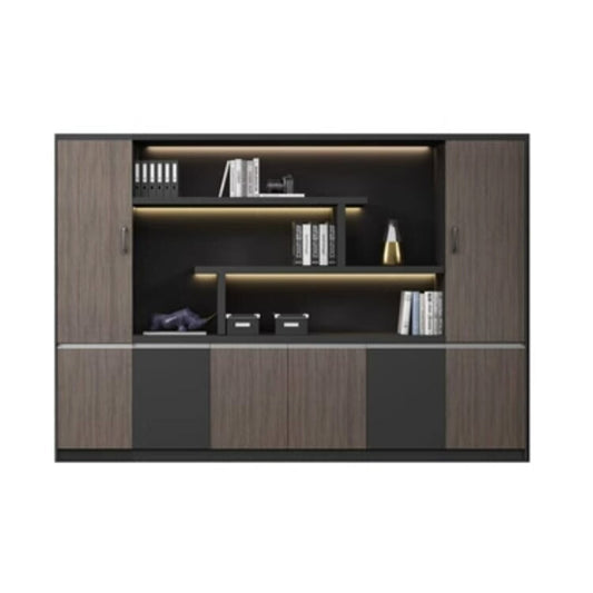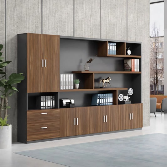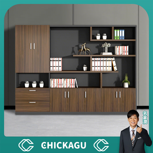 大容量 多段式 分類収納 オープン収納 扉付き 取っ手 台輪 安定性 キャビネット 収納棚 オフィス用 木目調 バイカラー 落ち着き 穏やか カスタマイズ可能 CWG-C023
