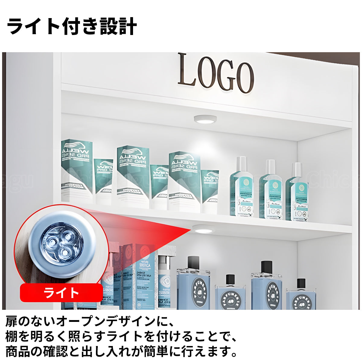 扉のないオープンデザインに、棚を明るく照らすライトを