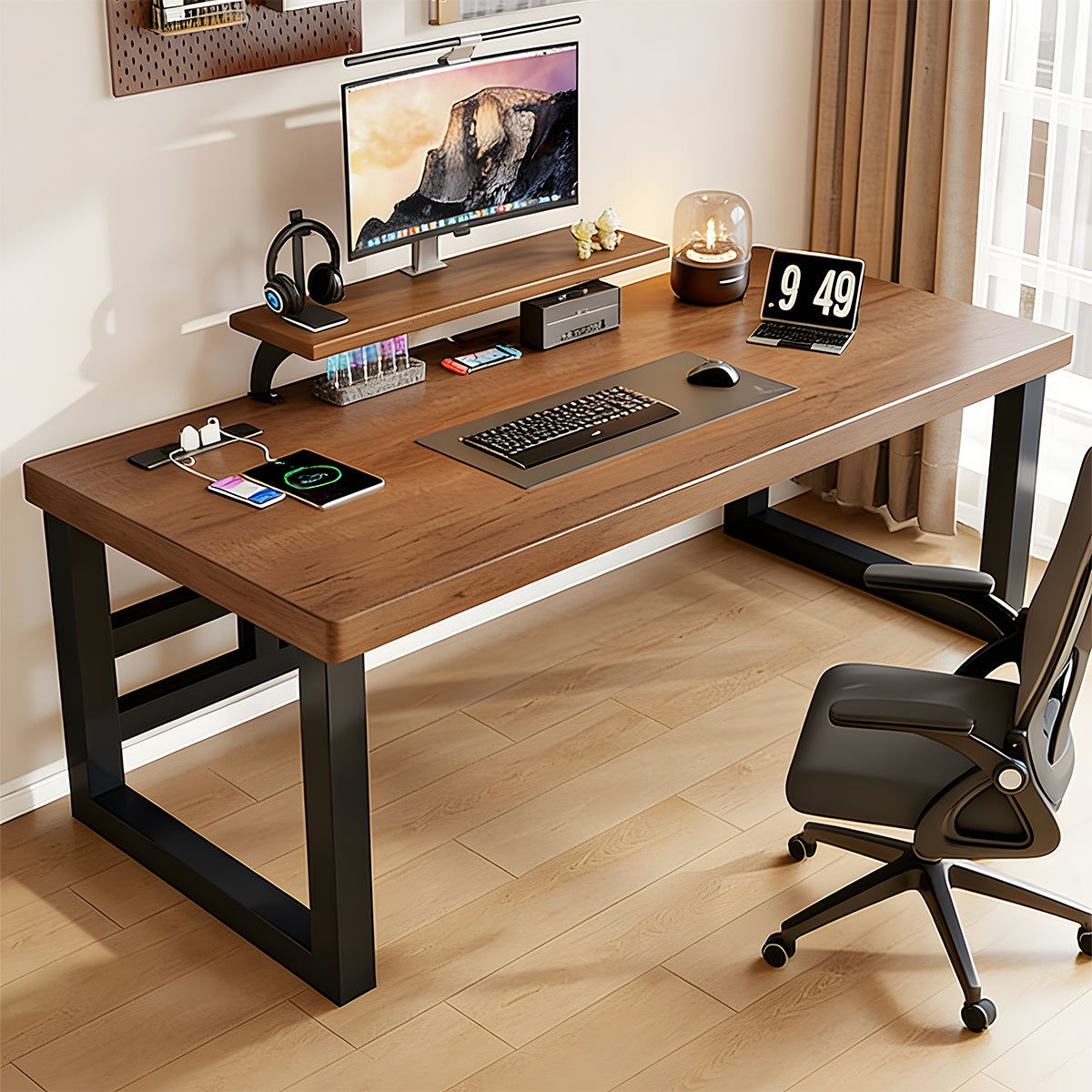デスク インドア 室内 パソコンデスク 天然木 広い天板 分厚い モニター置き棚 炭素鋼フレーム 頑丈 口字型 安定性 落ち着き 重厚感 カスタマイズ可能 SNZ-C040
